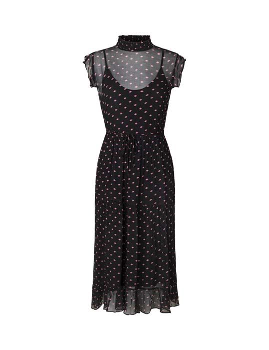 Smuk florlet kjole med høj hals, flæse kant ved skulderen og nederst på kjolen.